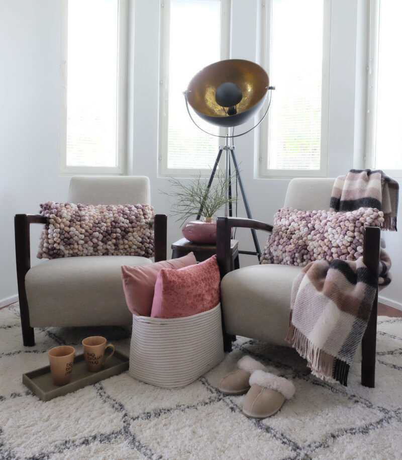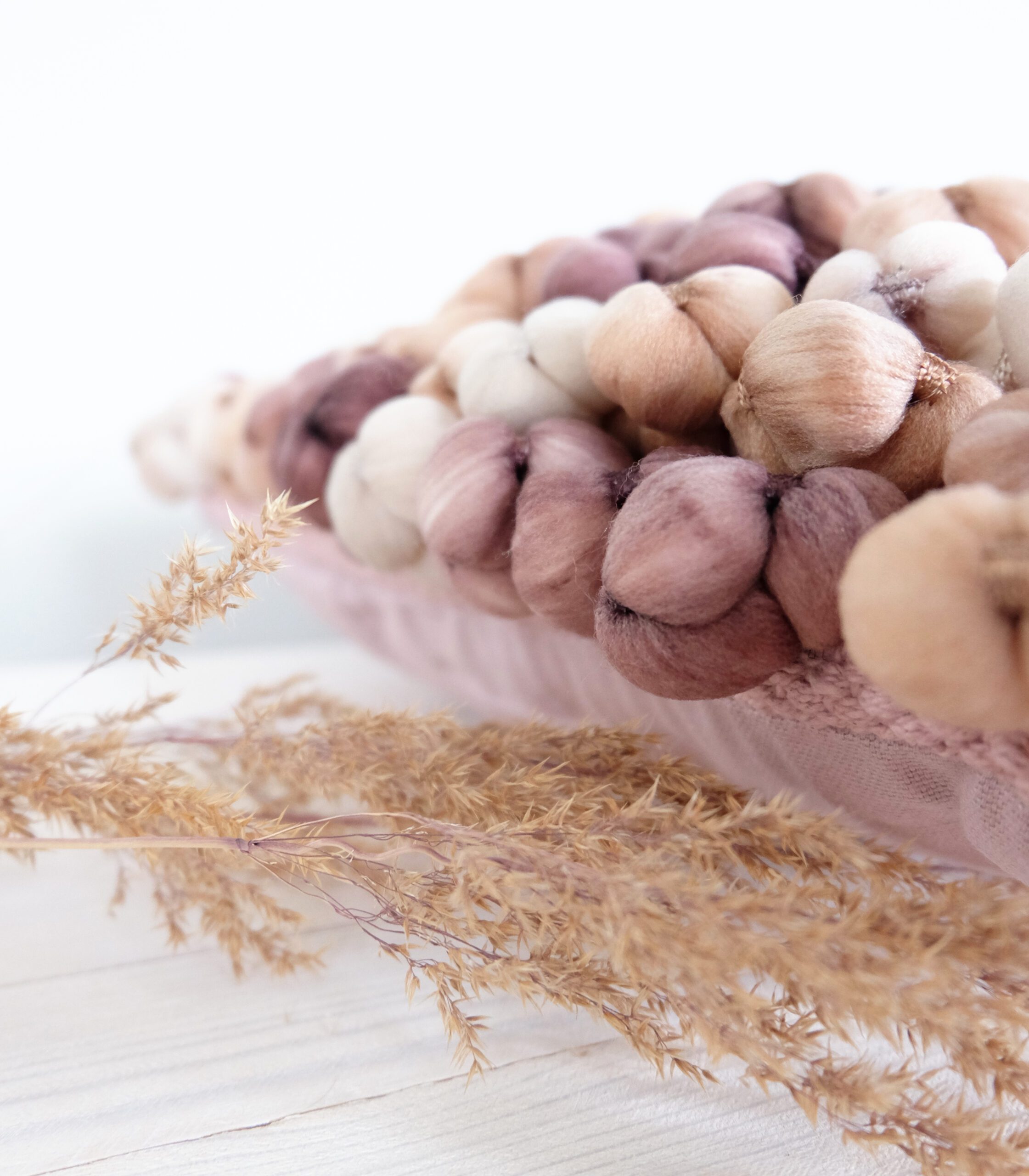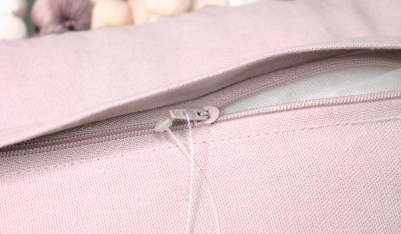 Koristetyynyn etupuolella on hauskoja palloja. Tyynyn takaosa on vaaleanpunaista kangasta, jossa on vetoketju. Mukaan kuuluu sisätyyny.