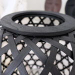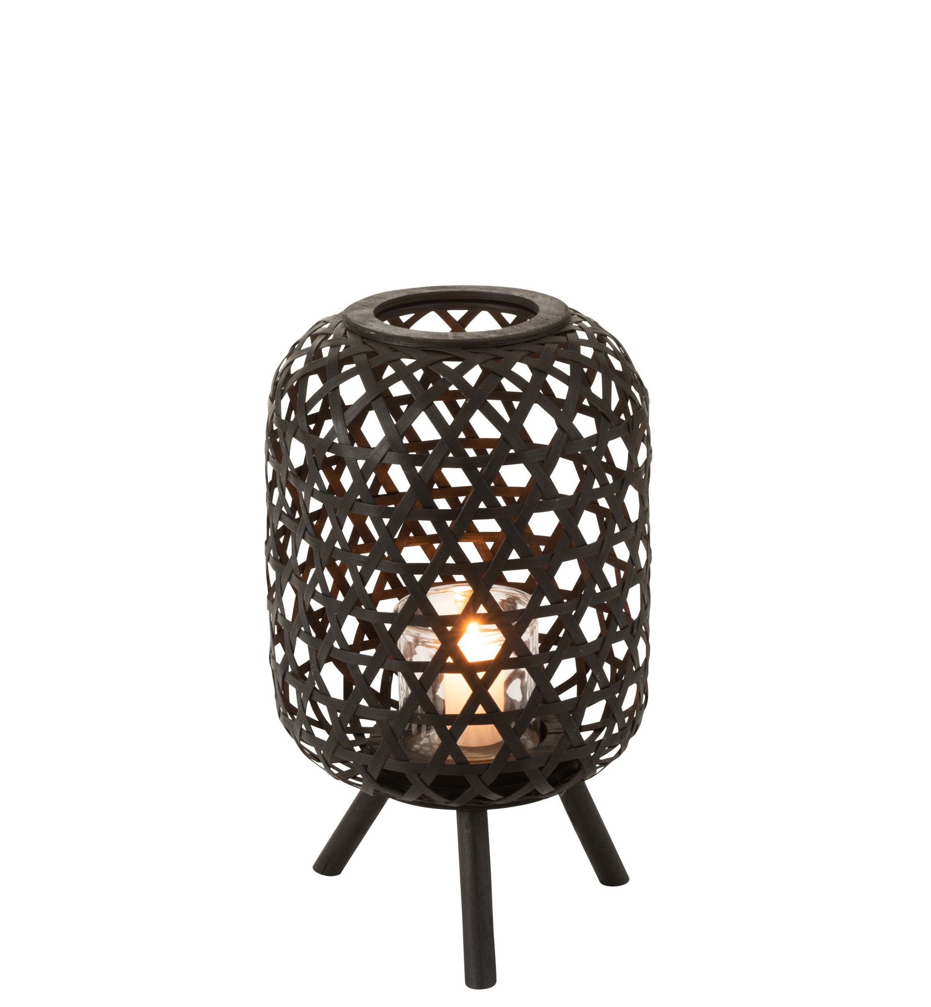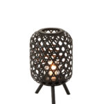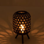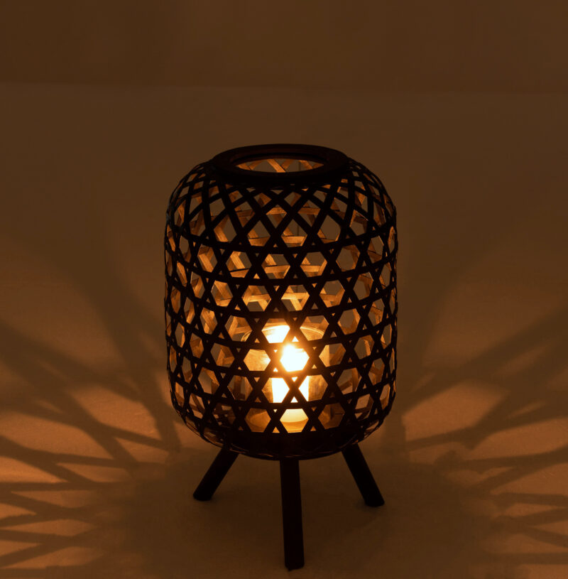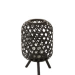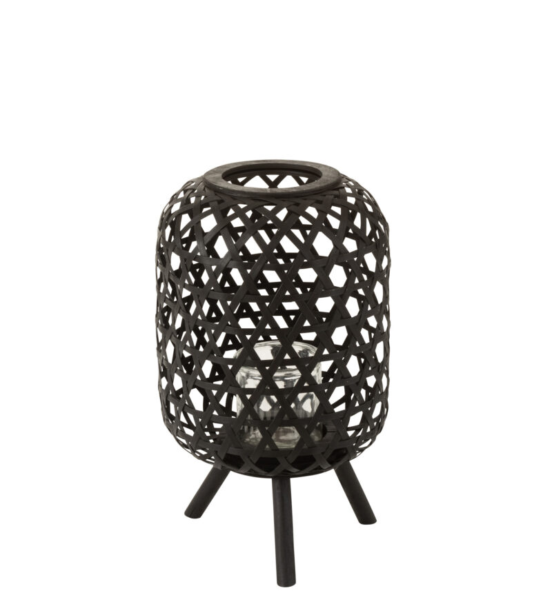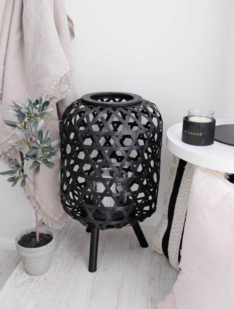 Upea jalallinen musta kynttilälyhty luonnonmateriaalia. Kynttilää varten mukana on lasinen kynttiläteline.