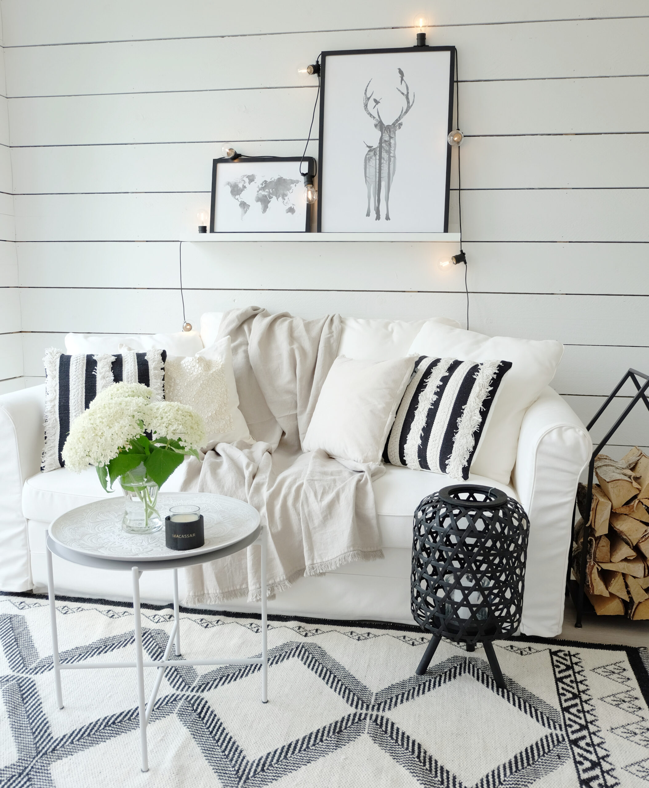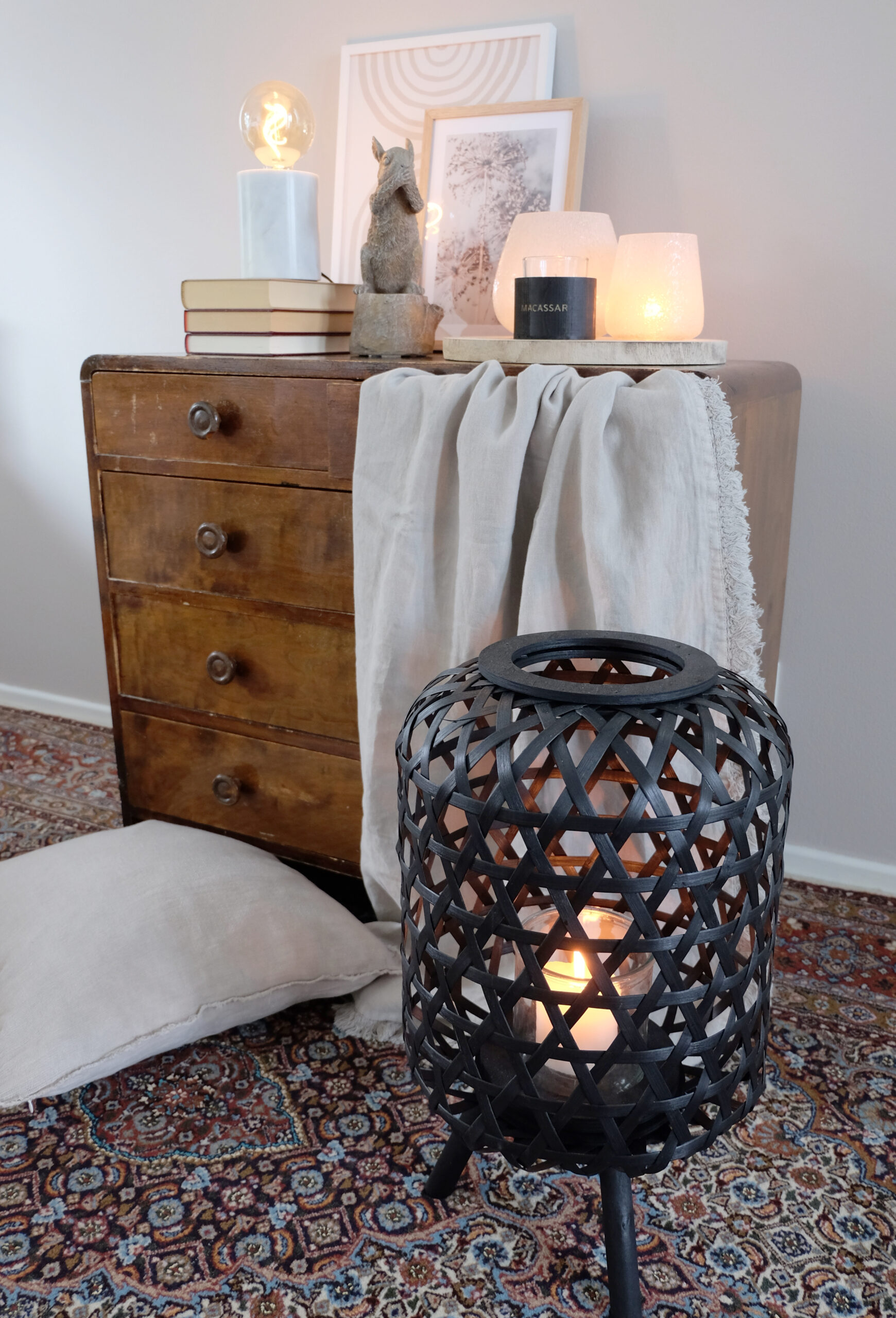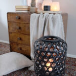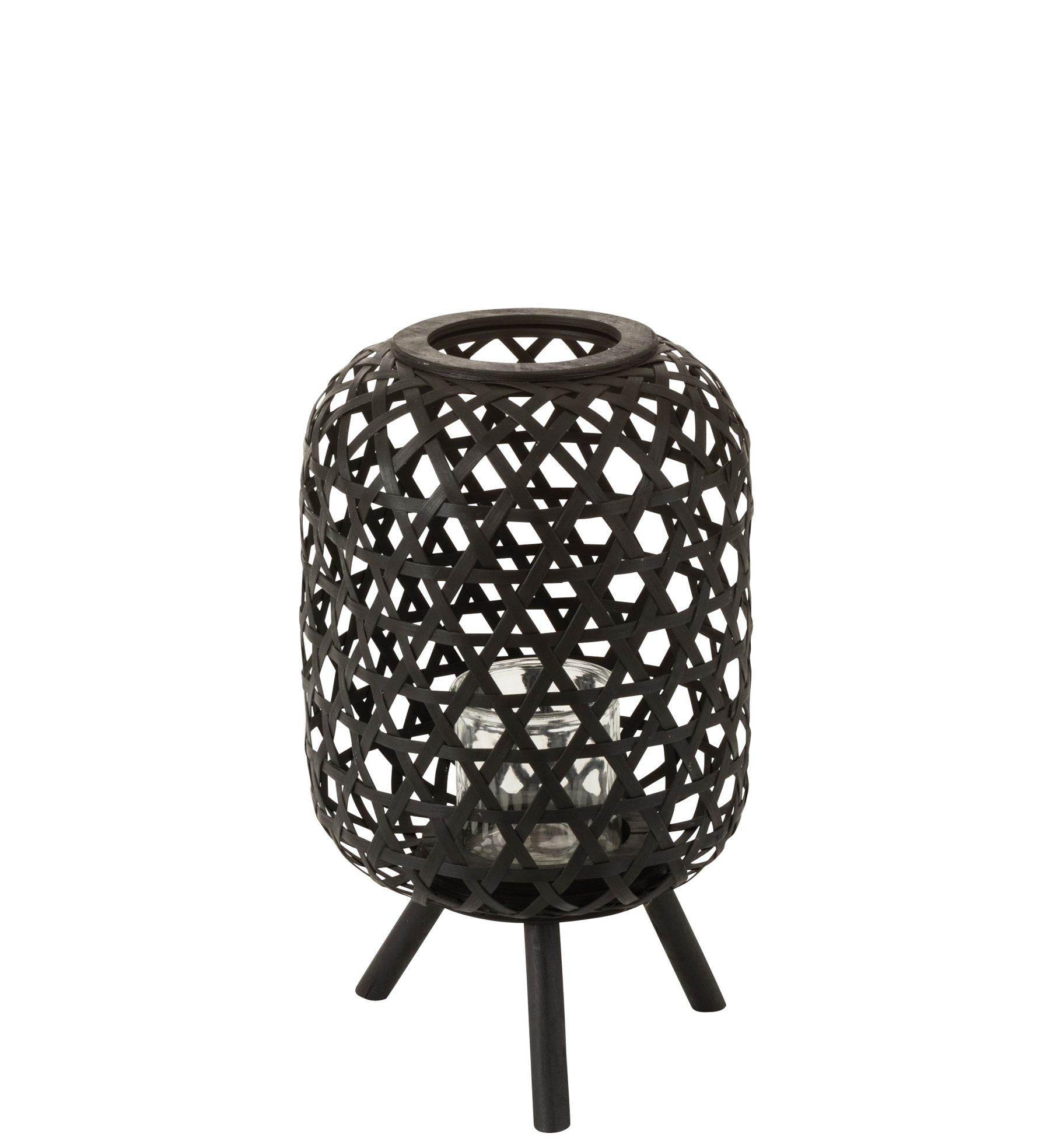 Upea jalallinen musta kynttilälyhty luonnonmateriaalia. Kynttilää varten mukana on lasinen kynttiläteline.