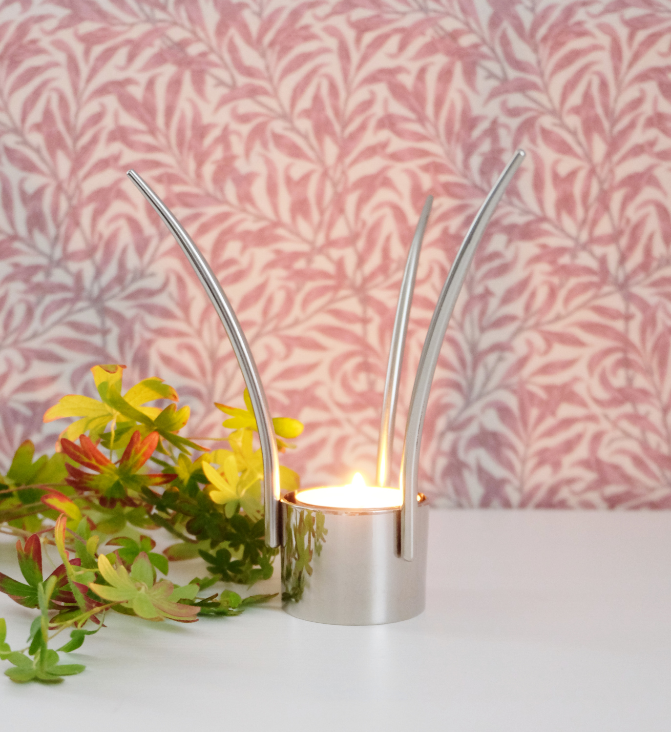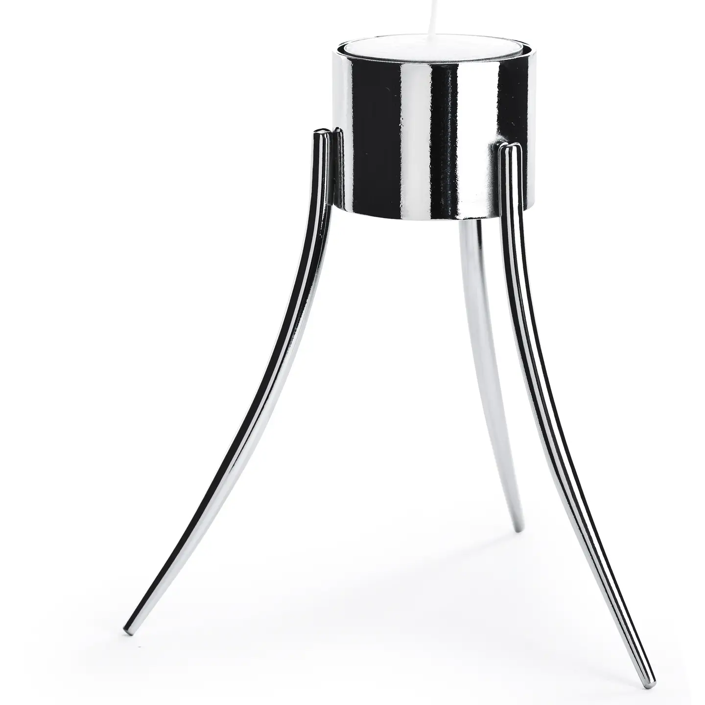 Tyylikäs teräksinen kynttilänjalka, jota voi käyttää kolmella eri tavalla: jaloilla seisten, ylösalasin jalat ylöspäin tai lasissa/maljakossa roikkuen.