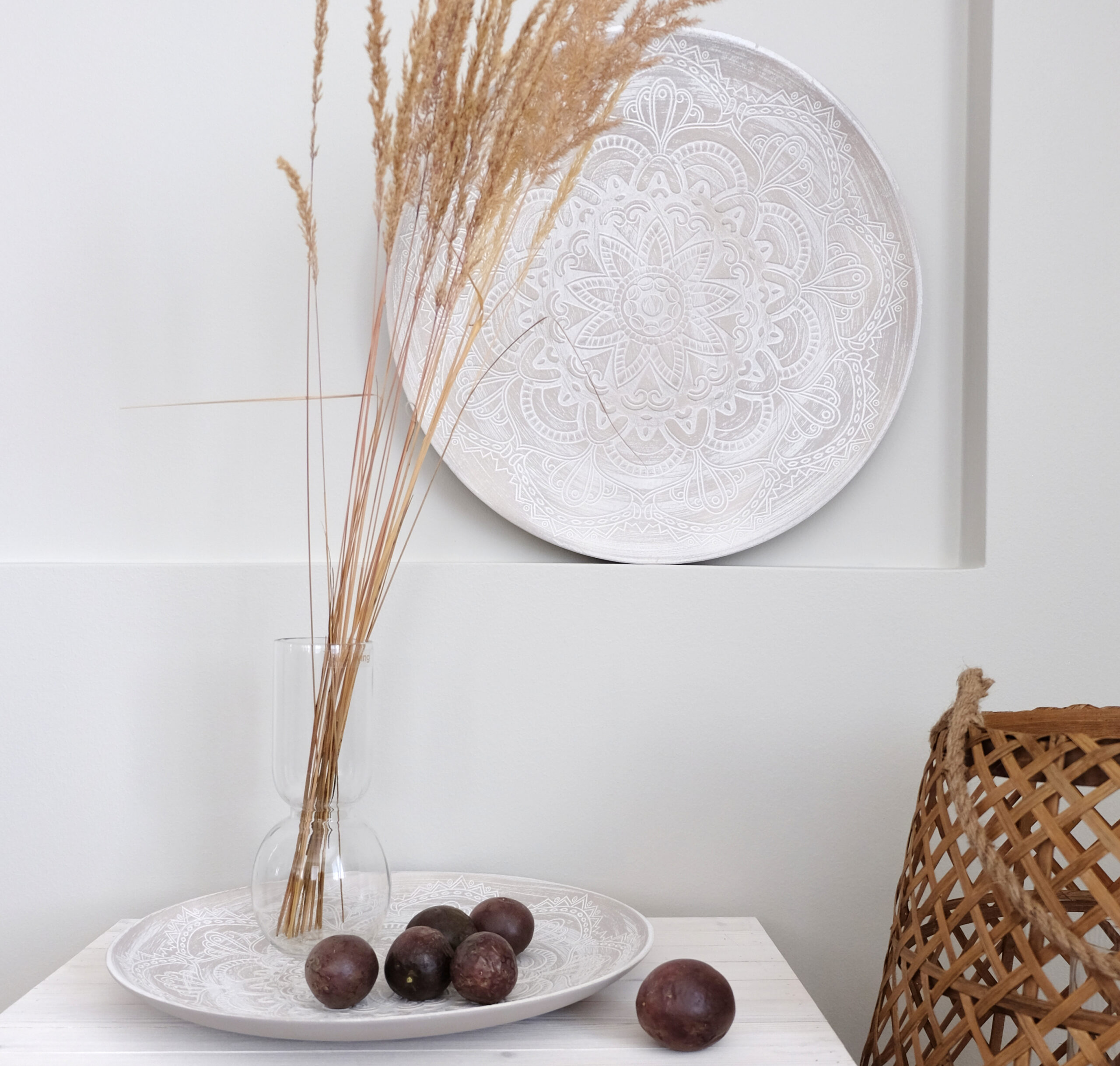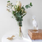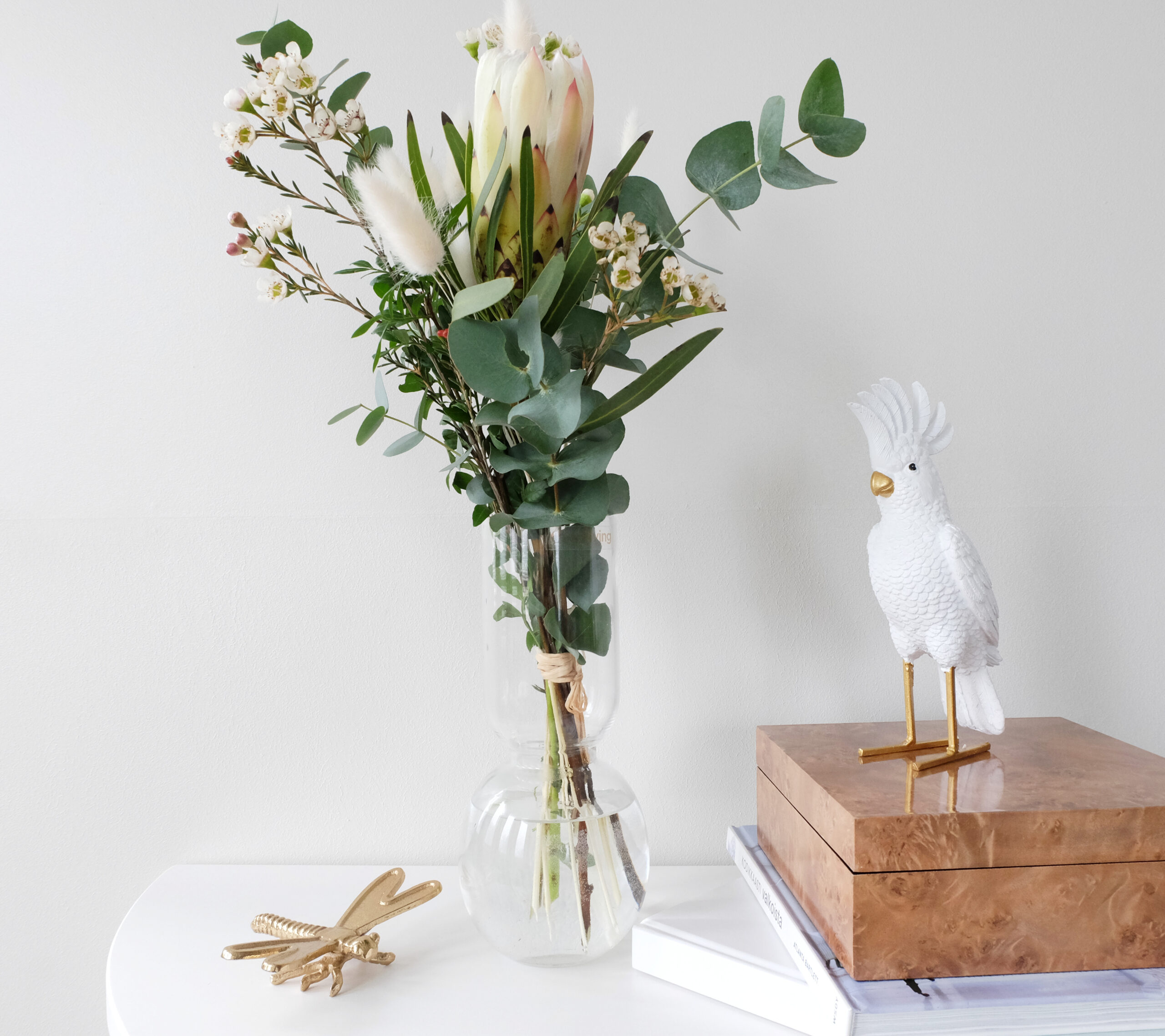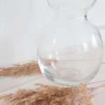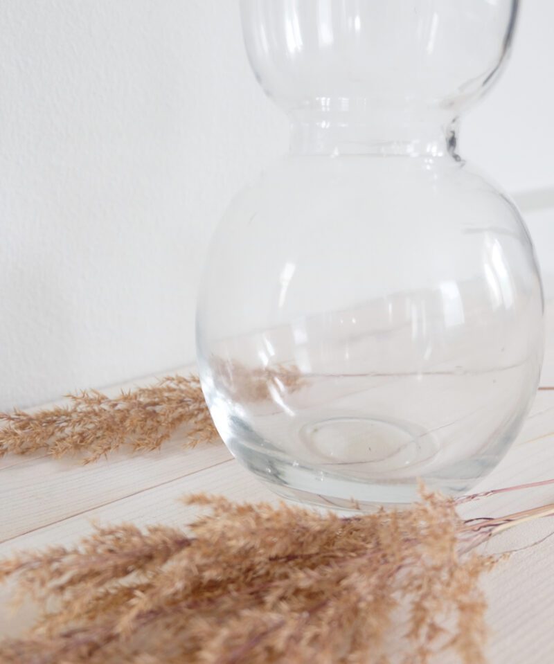 Kaunismuotoinen suupuhallettu lasimaljakko toimii upeasti kukkakimppujen ja heinien parina.
