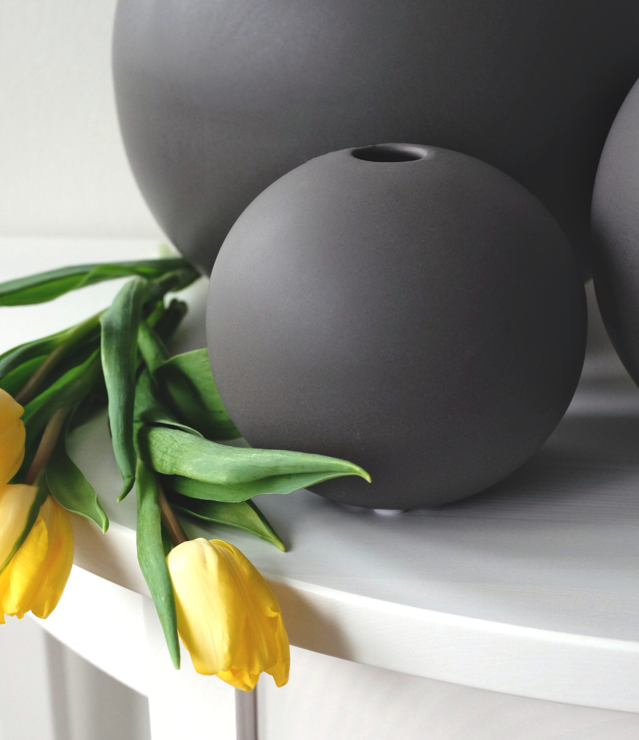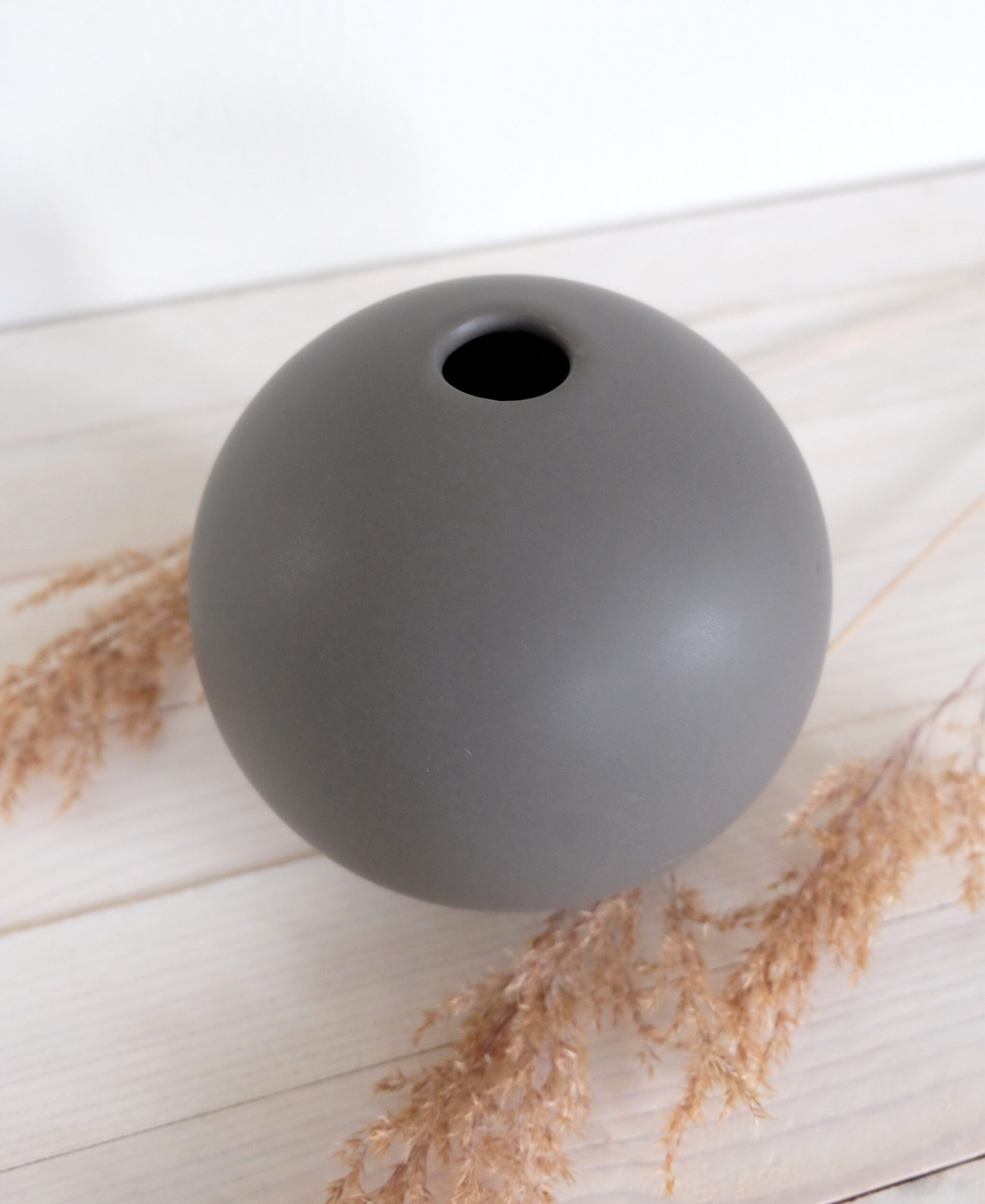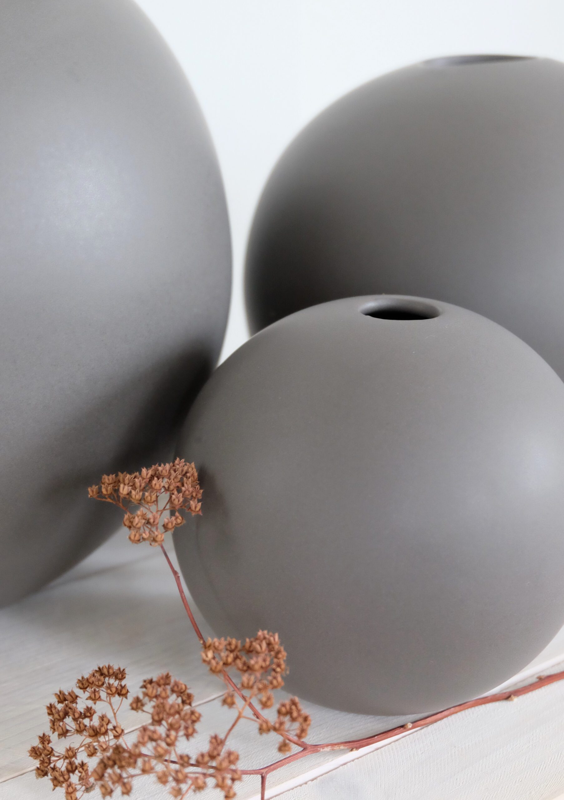 Keraaminen harmaa maljakko Pallo on näyttävä niin yksinään kuin ryhmäksi aseteltuna. Saatavana kolmessa eri koossa (pieni, keskikoko ja iso).