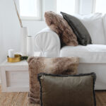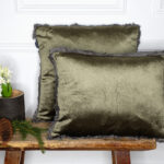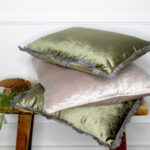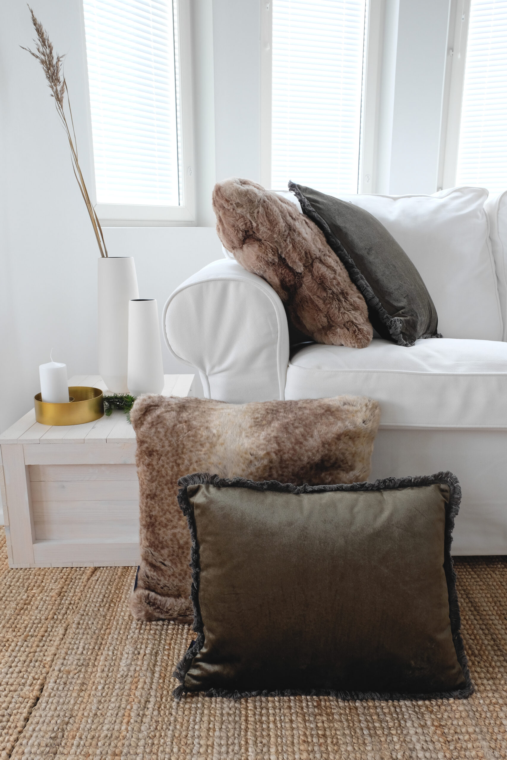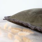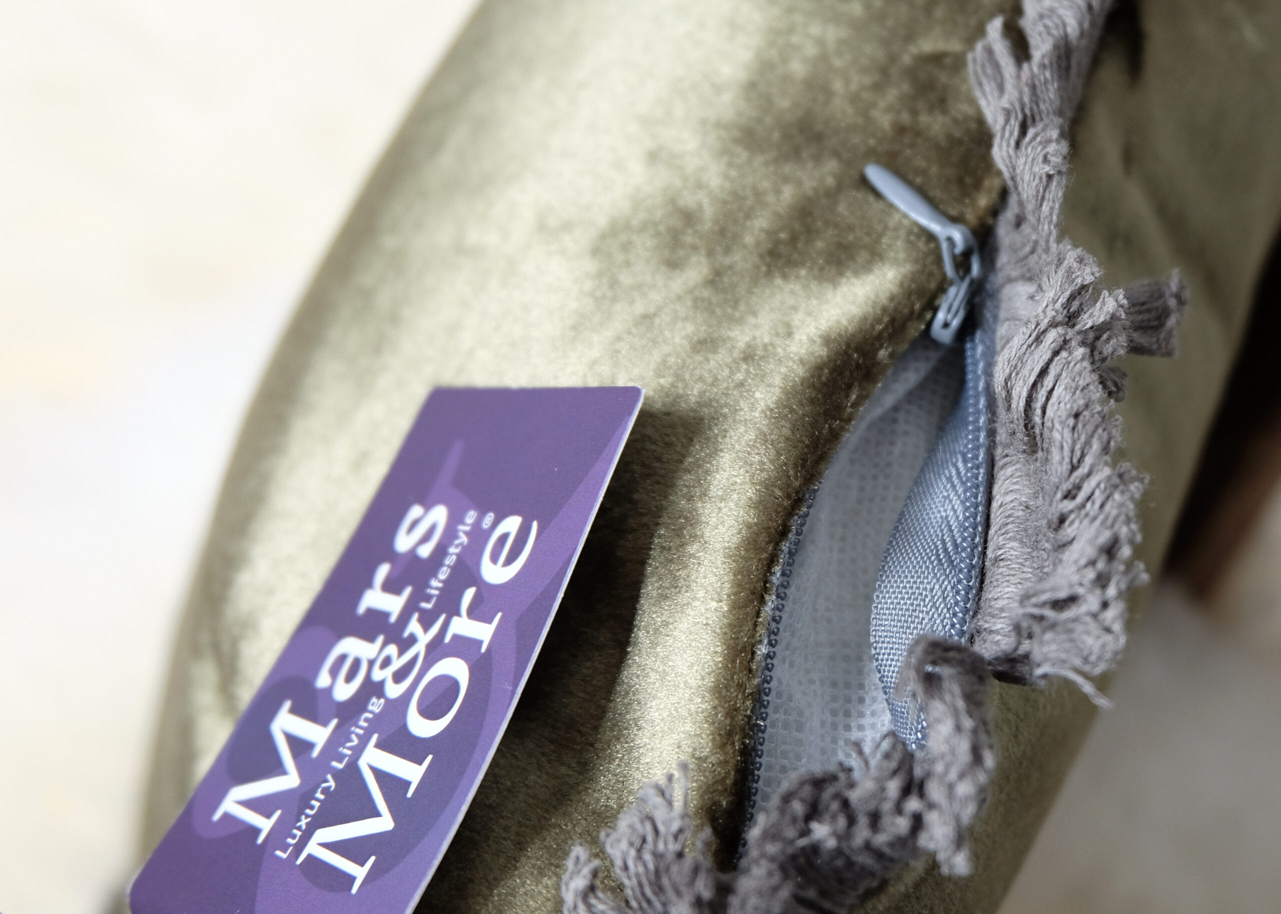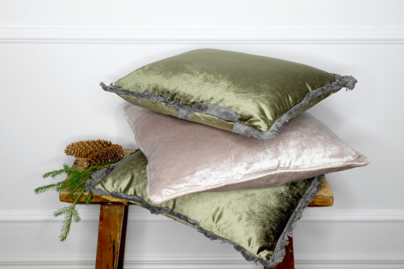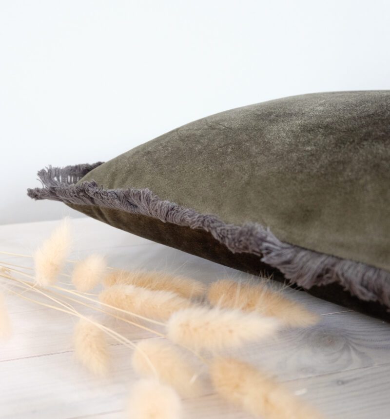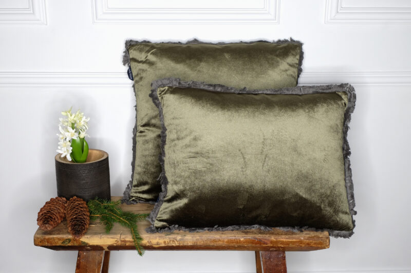 Kauniisti kiiltävä sisustustyyny sammaleenvihreää samettia. Pienet hapsut ympäröivät tyynynpäällistä. Vetoketju sivusaumassa. Mukaan kuuluu sisätyyny.