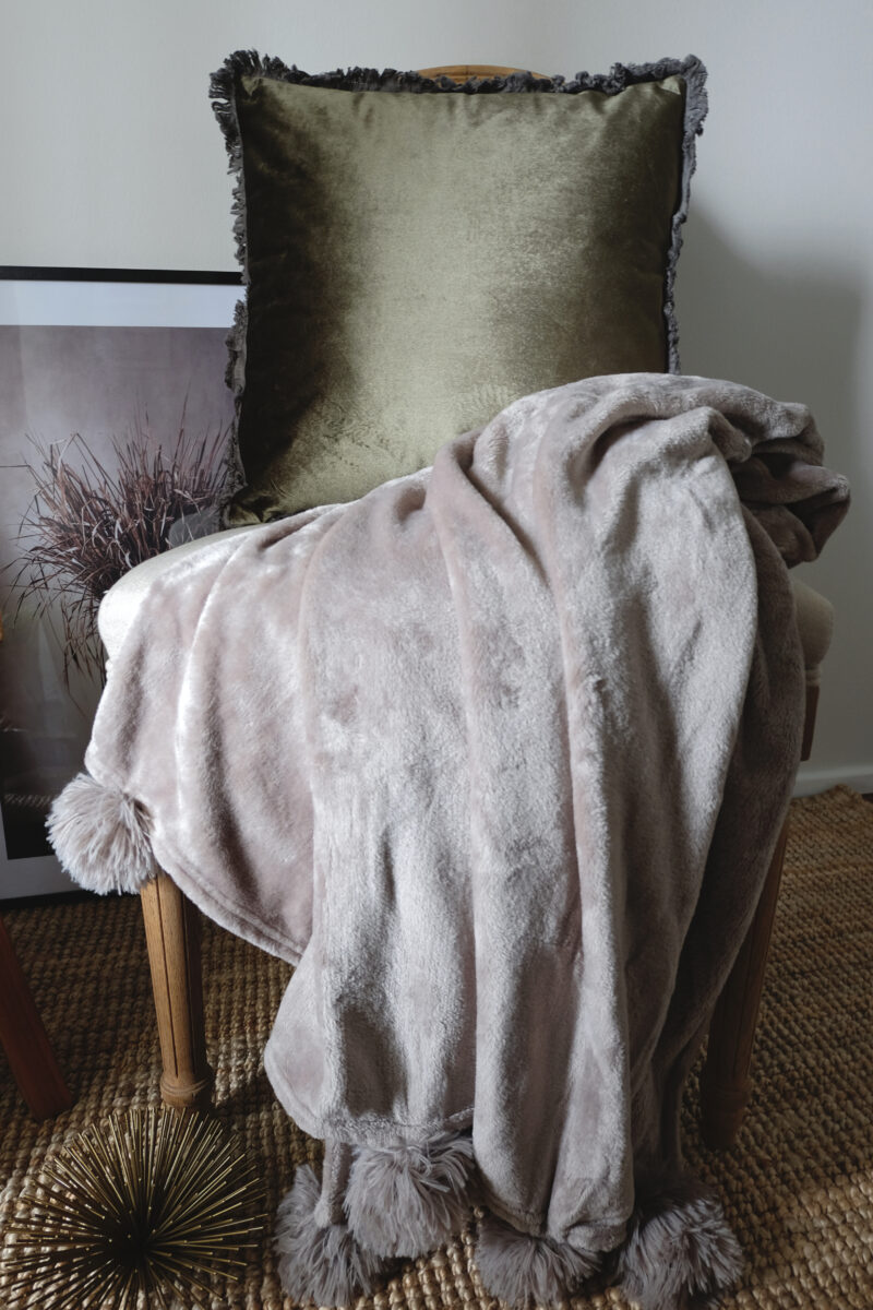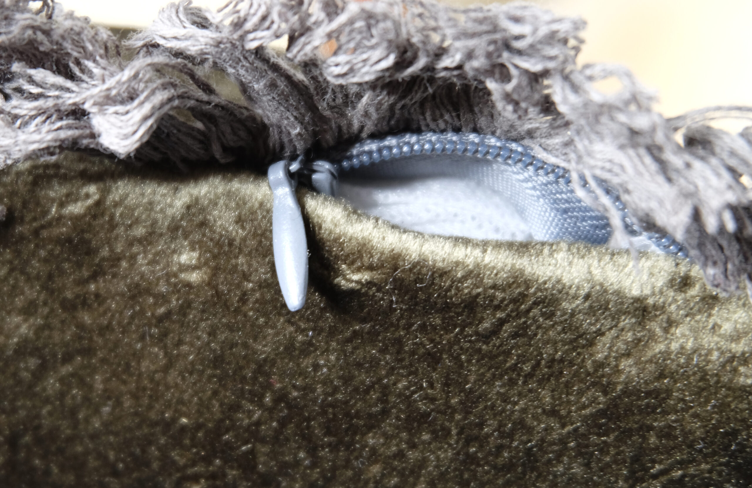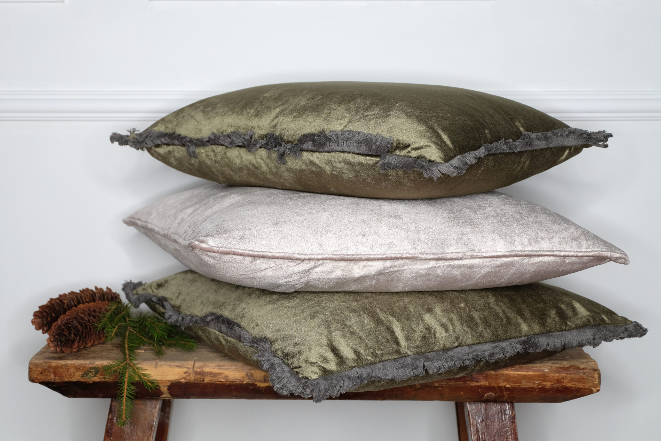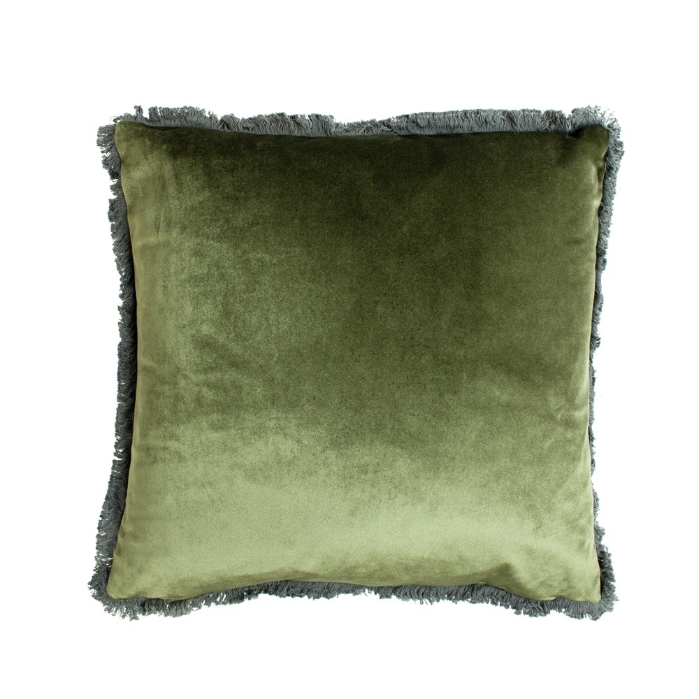 Kauniisti kiiltävä sisustustyyny sammaleenvihreää samettia. Pienet hapsut ympäröivät tyynynpäällistä. Vetoketju sivusaumassa. Mukaan kuuluu sisätyyny.