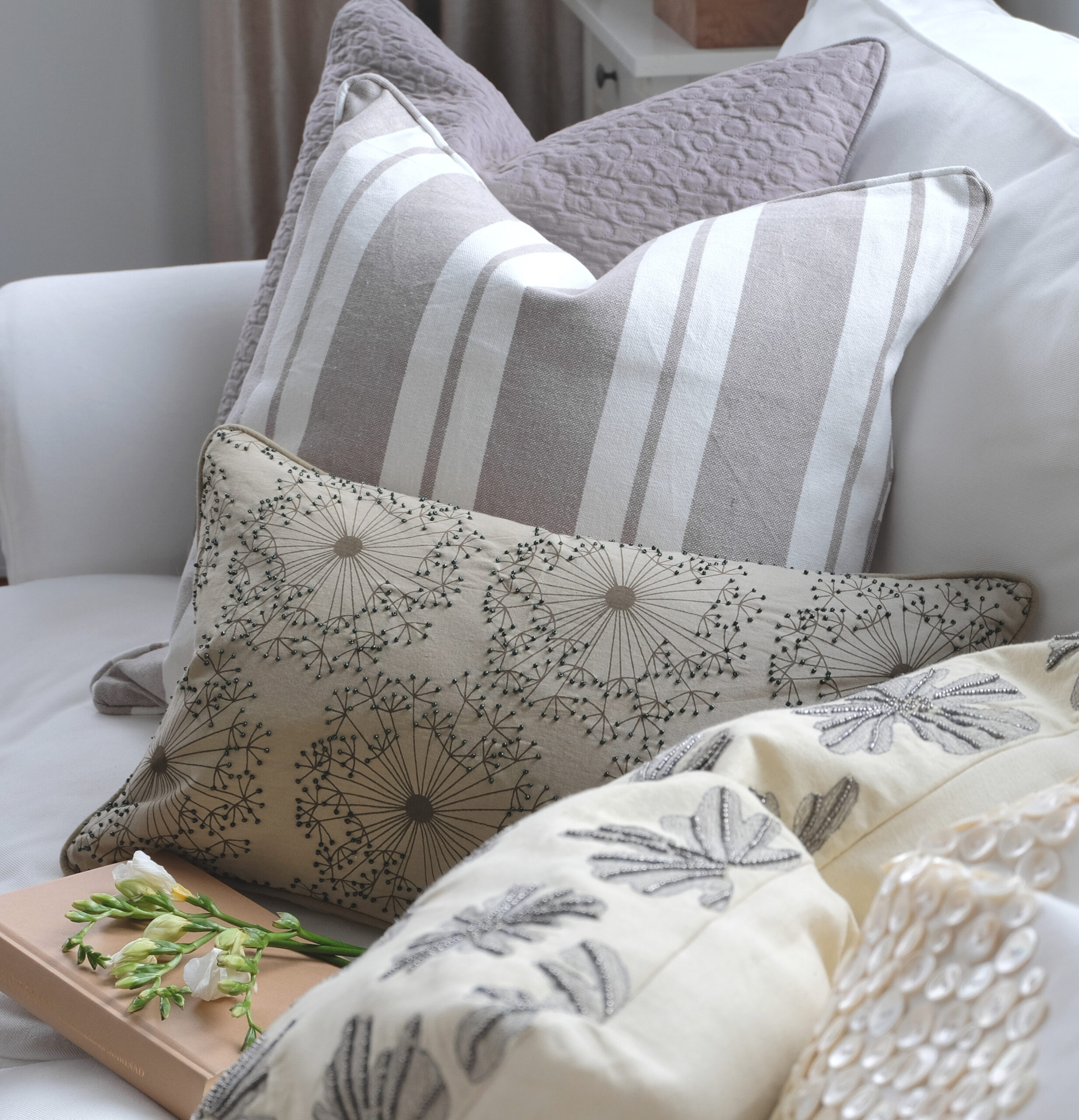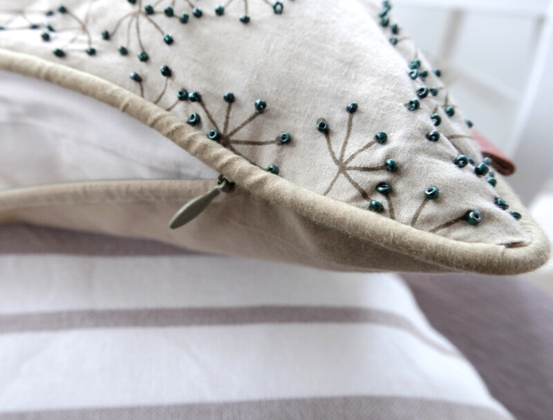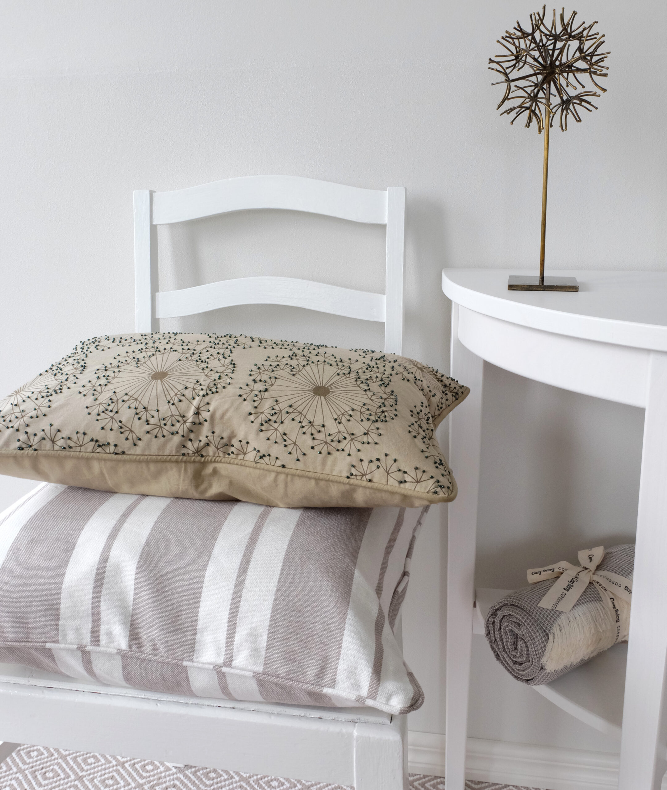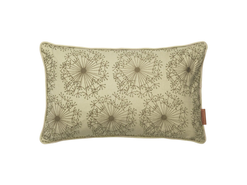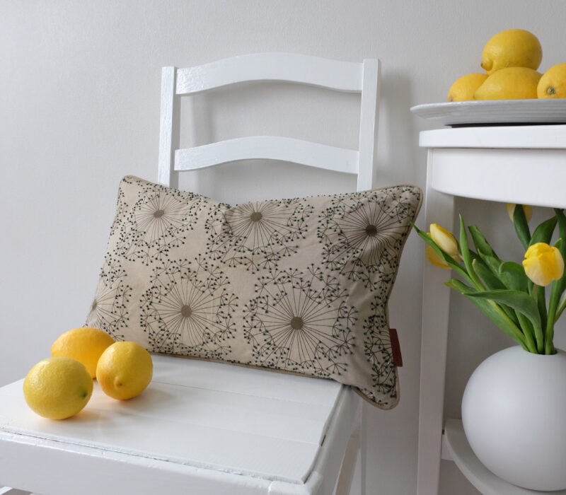 Ihastuttava etupuolelta helmikoristeltu sisustustyyny voikukan höytyvä-kuviolla. Sopii hyvin yhteen Voikukka-pöytäkoristeen kanssa. Vetoketju sivusaumassa. Mukaan kuuluu Oeko-Tex sertifioitu untuvainen sisätyyny.