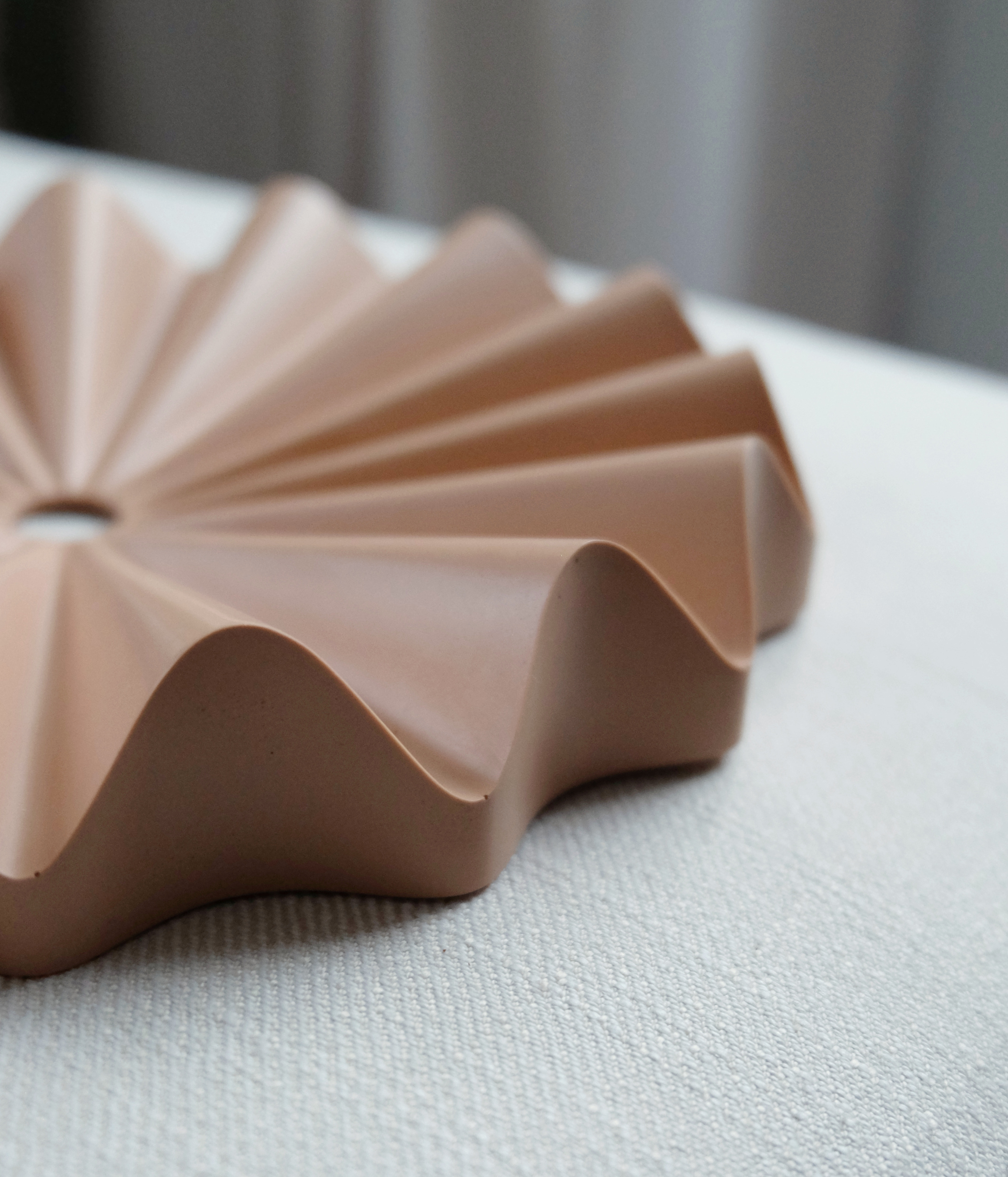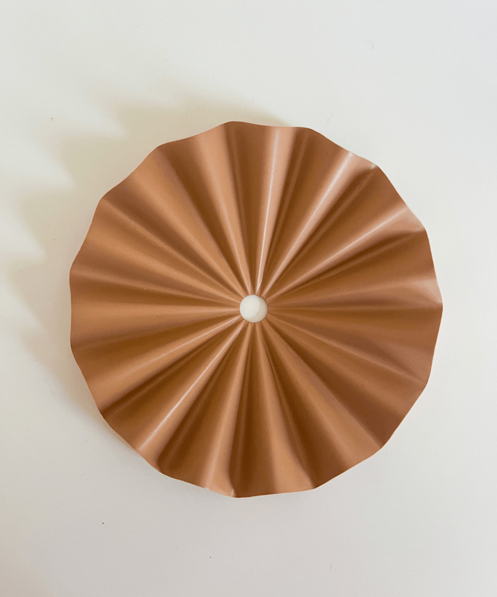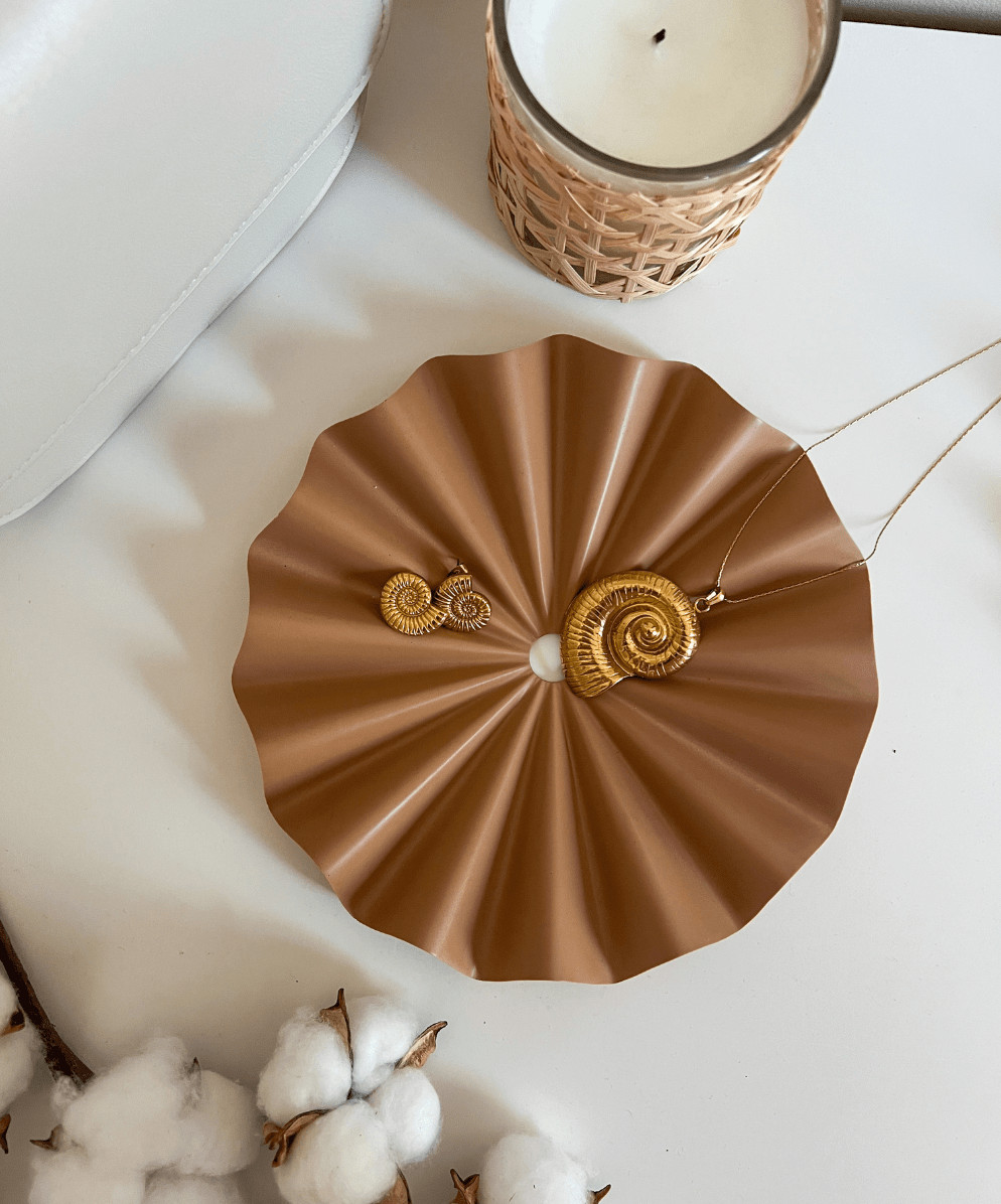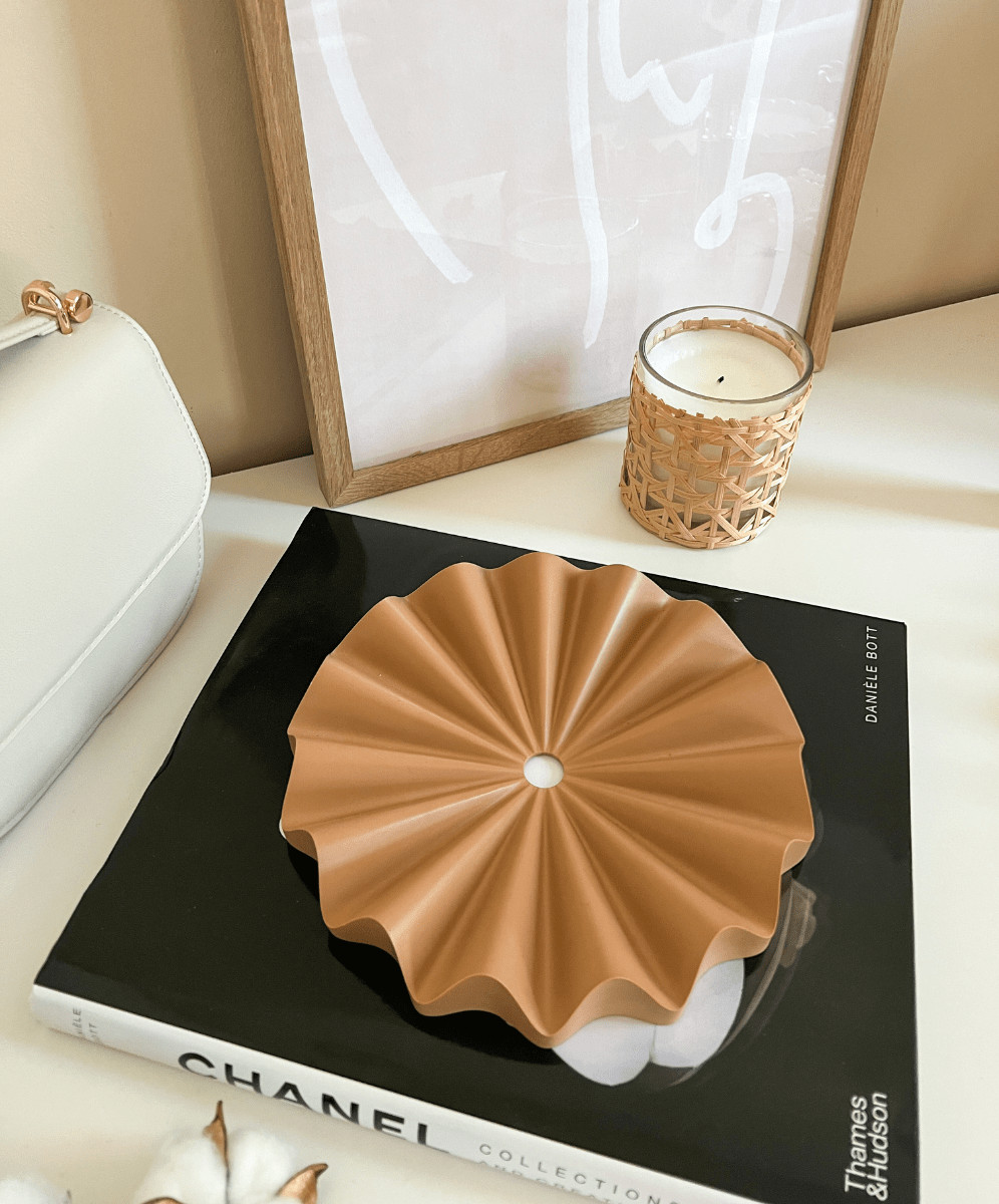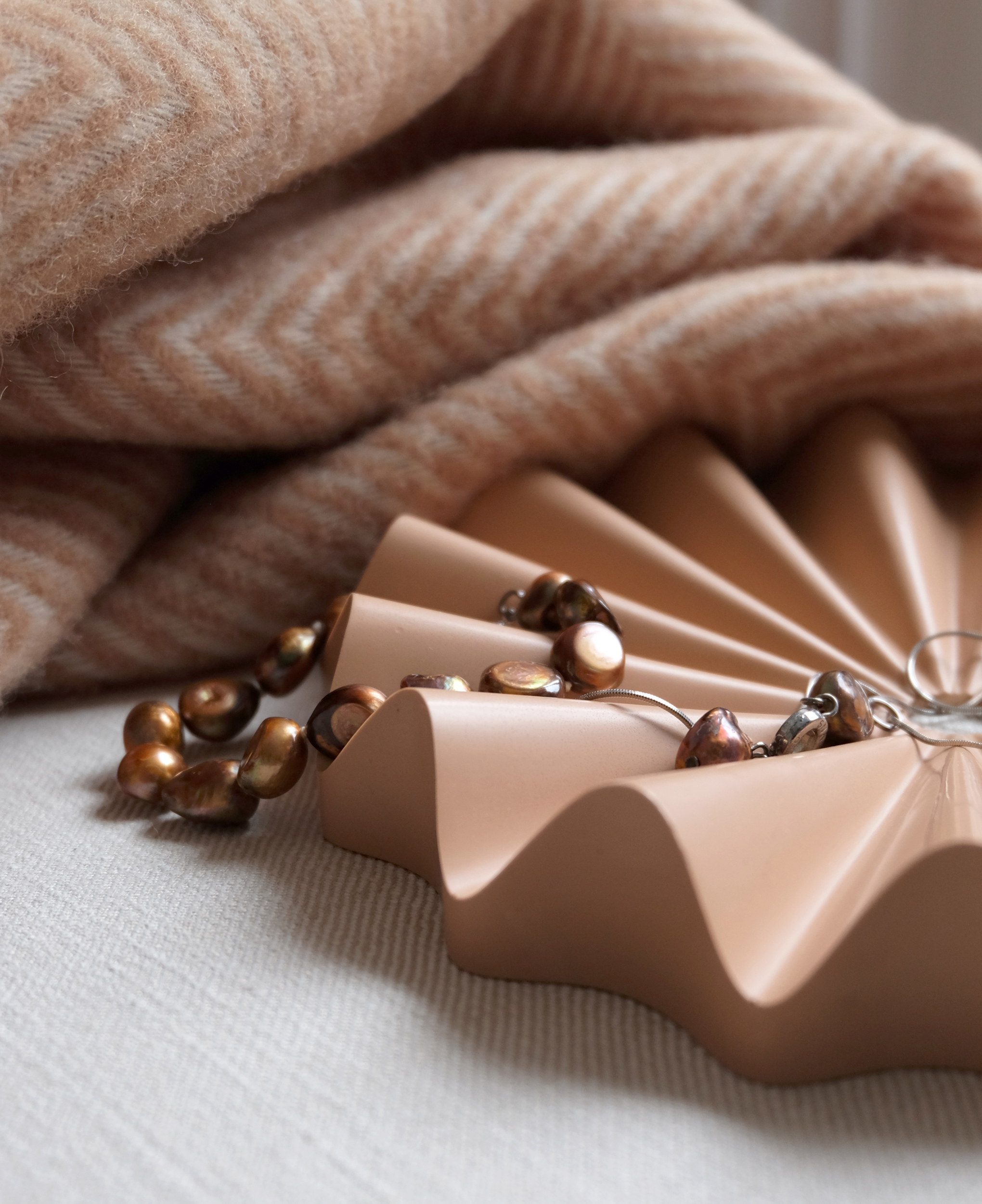 Pyöreä ja pinnaltaan aaltoileva tarjotin on täydellinen korujen ja pienten esineiden säilyttämiseen tai kaunistamaan sisustusta sellaisenaan. Tyylikäs vaaleanruskea tarjotin on valmistettu kokonaan käsin. Tästä johtuen kuvioissa ja väreissä voi esiintyä pieniä vaihteluita sekä pieniä ilmakuplia, jotka näkyvät pieninä reikinä valmiissa tuotteessa, mikä lisää sen ainutlaatuisuutta.