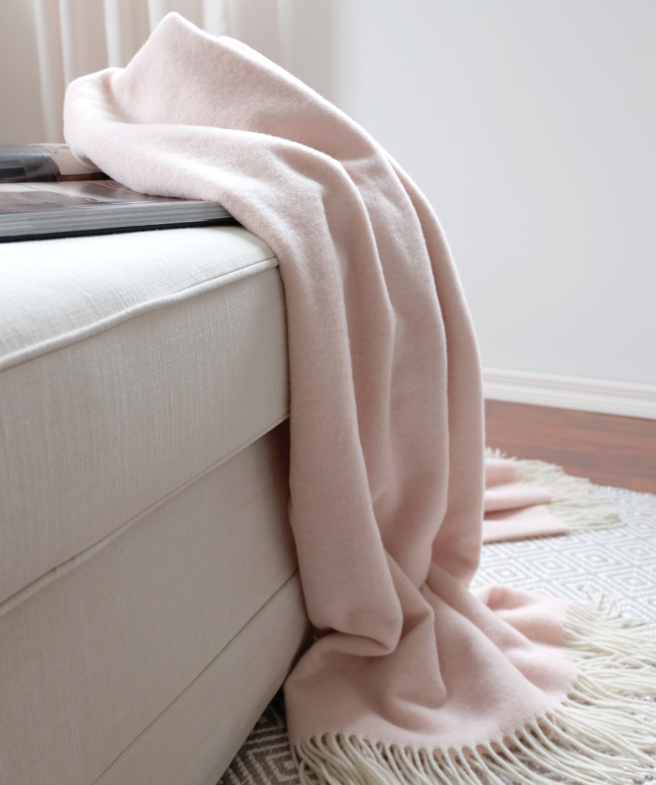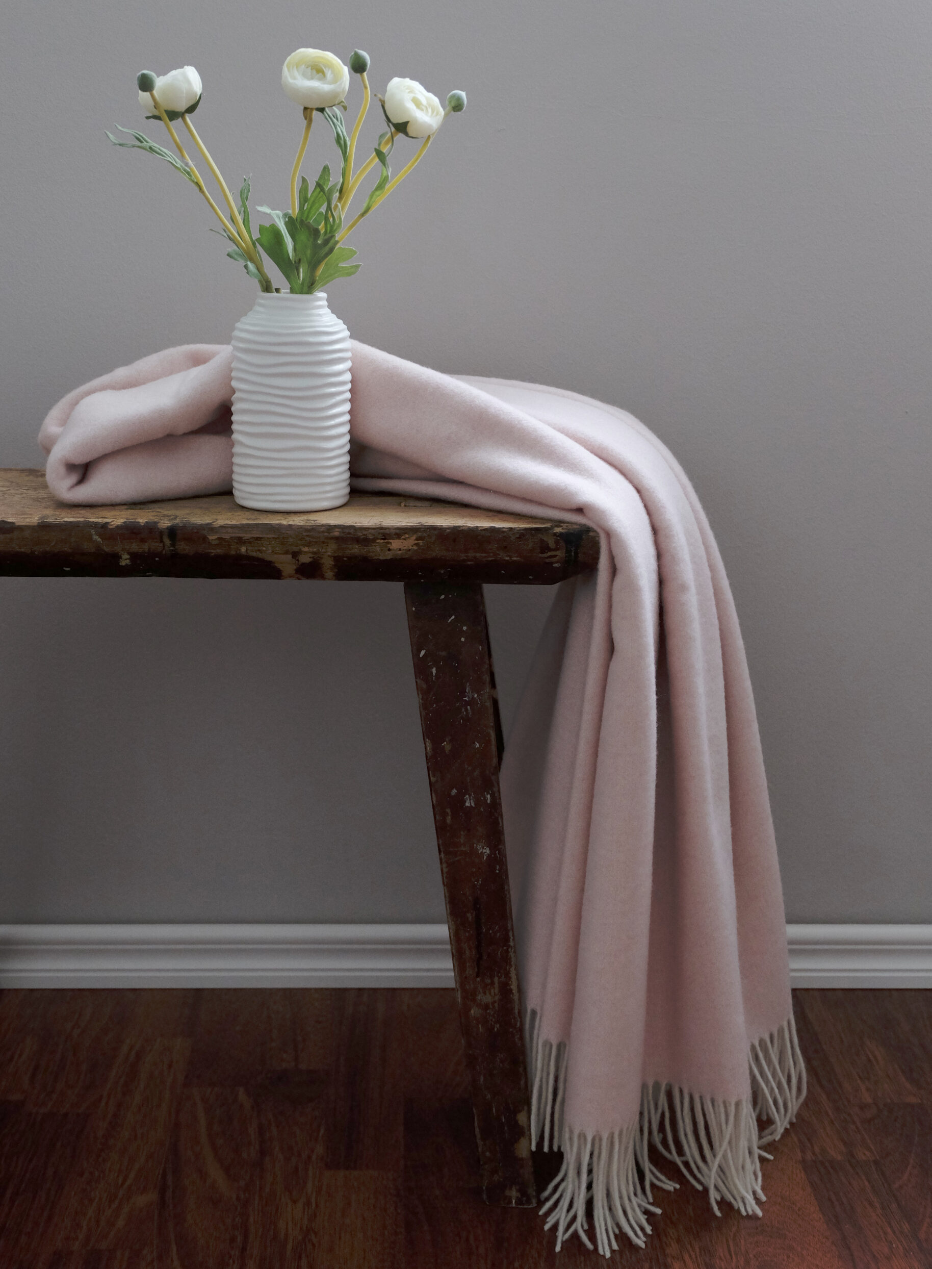 Upea vaaleanpunainen torkkupeitto on saanut vaikutteita Milanon ajattomasta tyylikkyydestä. Pehmeä torkkupeitto on valmistettu Ukrainassa 90 % merinovillasta ja 10 % kashmirvillasta.